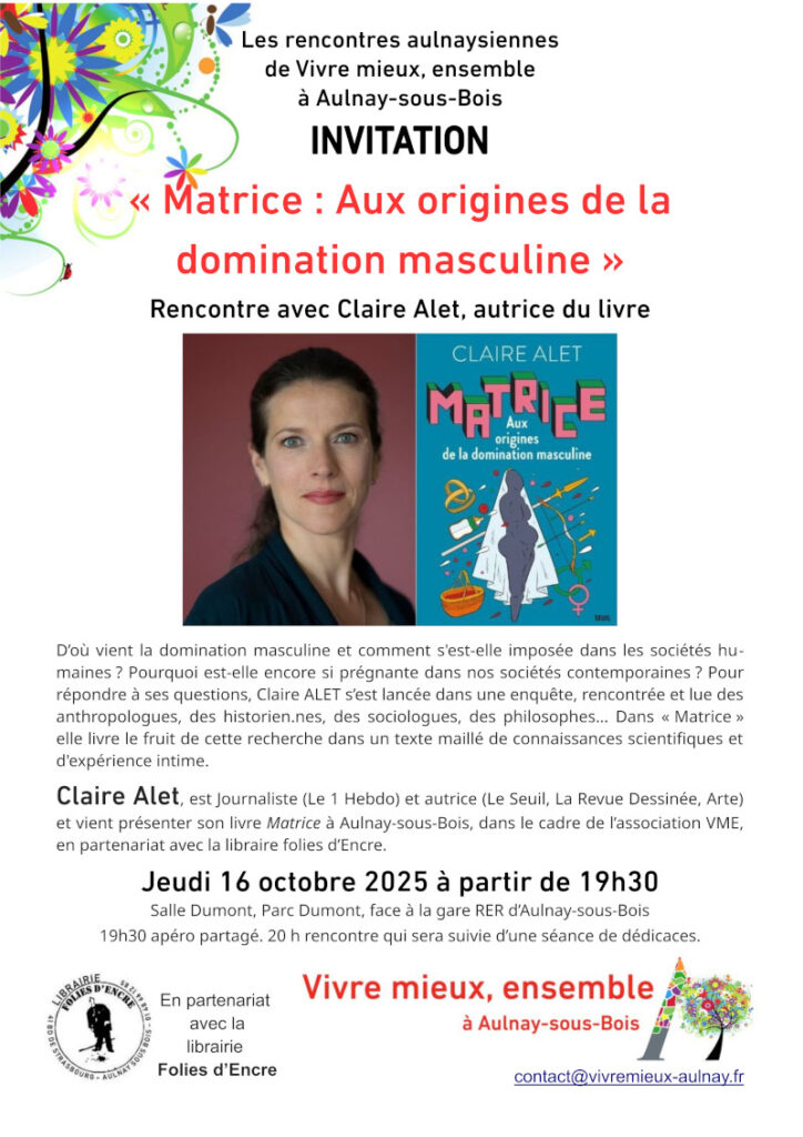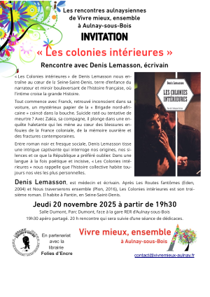 Jeudi 20 novembre 2025 à partir de 19h30, Salle Dumont, Parc Dumont, face à la gare RER d’Aulnay-sous-Bois, 19h30 apéro partagé. 20 h rencontre qui sera suivie d’une séance de dédicaces.