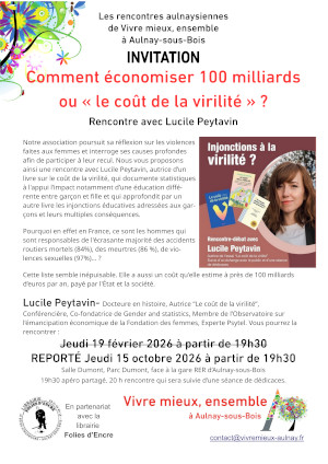 Notre association poursuit sa réflexion sur les violences faites aux femmes et interroge ses causes profondes afin de participer à leur recul. Nous vous proposons ainsi une rencontre avec Lucile Peytavin, autrice d’un livre sur le coût de la virilité, qui documente statistiques à l’appui l’impact notamment d’une éducation différente entre garçon et fille et qui approfondit par un autre livre les injonctions éducatives adressées aux garçons et leurs multiples conséquences.