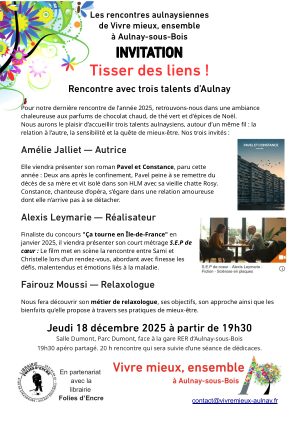 Jeudi 18 décembre 2025 à partir de 19h30, Salle Dumont, Parc Dumont, face à la gare RER d’Aulnay-sous-Bois, 19h30 apéro partagé. 20 h rencontre qui sera suivie d’une séance de dédicaces.